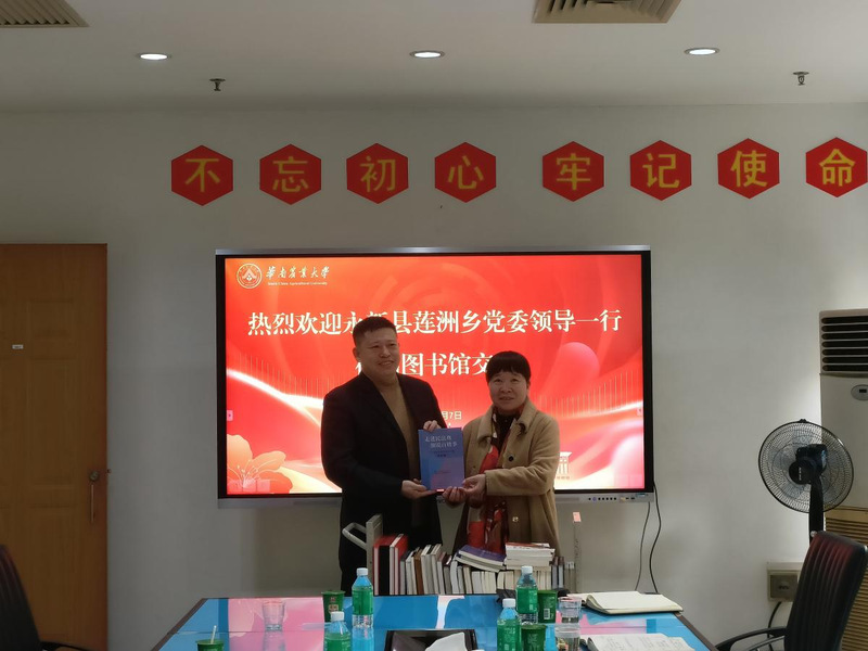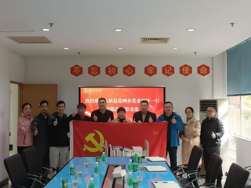 为高质量推进书记项目“党建强基•书香育人•文化铸魂”—党建引领书香校园“3+2+1”模式,3月7日,华农图书馆党总支以“党建引领,文化铸魂”为主题,开展了一次别开生面的党日交流活动。江西省吉安市永新县莲洲乡党委书记朱谞辉带队,联合江西广州永新商会刘勇民会长一行六人到访华农图书馆,共同探讨文化传承与乡村振兴的创新路径。