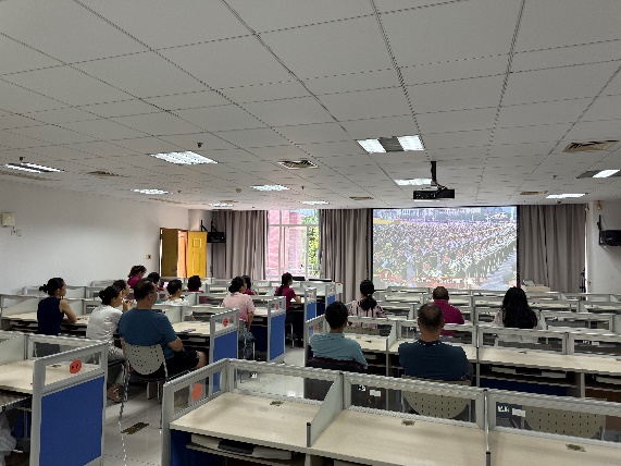紧接着,支部党员们全程观看了气势恢宏、威武雄壮的阅兵仪式。屏幕上,受阅部队官兵军容严整、士气高昂,以铿锵有力的步伐、排山倒海的气势依次通过天安门广场,充分展现了人民军队听党指挥、能打胜仗、作风优良的强大战斗力。一系列代表国家防御力量最新成就的现代化装备依次亮相,彰显了我国国防和军队现代化建设的辉煌成就,展现了捍卫国家主权、安全、发展利益的坚定决心和强大实力。这场规模盛大、庄严震撼的阅兵,是一场生动的爱国主义教育和国防教育,让每一位观看的同志都倍感自豪、深受鼓舞,深切感受到国威军威,感受到和平与发展的来之不易,感受到身后有一个强大祖国的无比底气。