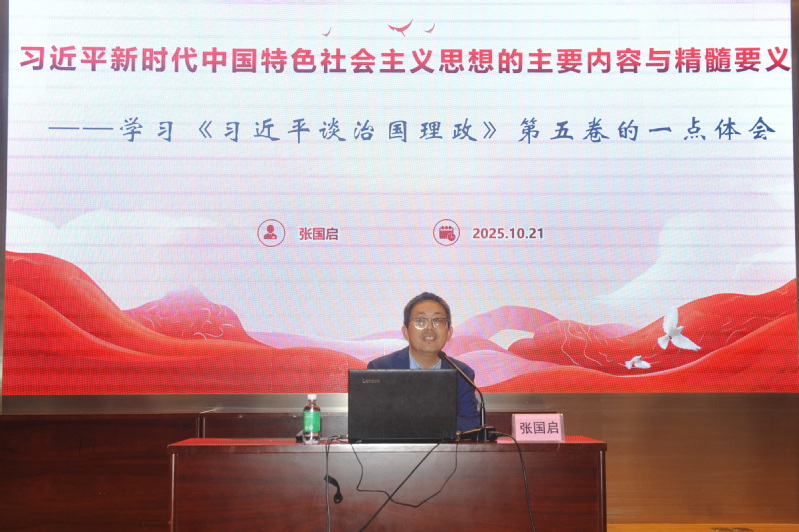《习近平谈治国理政》第五卷是全面系统反映习近平新时代中国特色社会主义思想最新成果的权威著作,集中展现了以习近平同志为核心的党中央坚持“两个结合”、推进马克思主义中国化时代化的最新成果。授课中,张国启教授以“理论学习—思想阐释—实践要求”为主线展开。他首先强调,重视全党的学习是党推动事业发展的成功经验,马克思主义是指导党和人民事业的根本理论,习近平新时代中国特色社会主义思想是当代中国马克思主义、二十一世纪马克思主义。随后,他详细解读了习近平新时代中国特色社会主义思想的主要内容,指出“十个明确”“十四个坚持”“十三个方面成就”相互贯通,构成系统科学的理论体系,同时深入阐释“六个坚持”的精髓要义,深入解读习近平新时代中国特色社会主义思想的世界观和方法论。