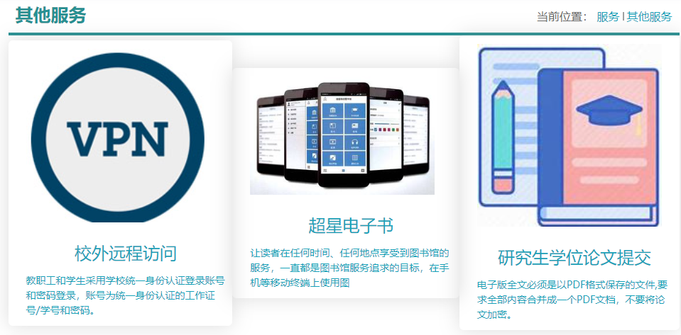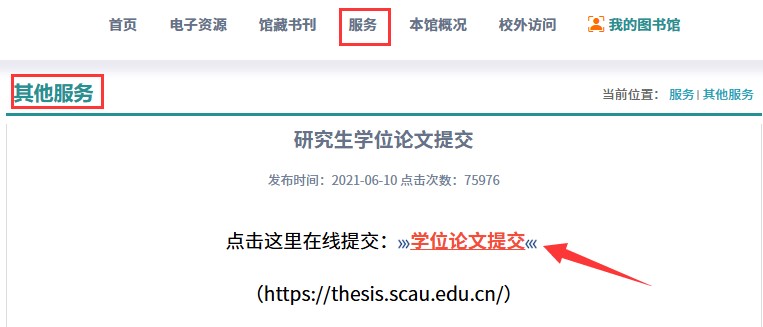 校内毕业研究生登陆图书馆主页,依次点击:服务-->其他服务-->研究生学位论文提交。校外毕业研究生通过VPN登陆:https://metc.scau.edu.cn/2019/0610/c7513a187702/page.htm。见图1至图4。