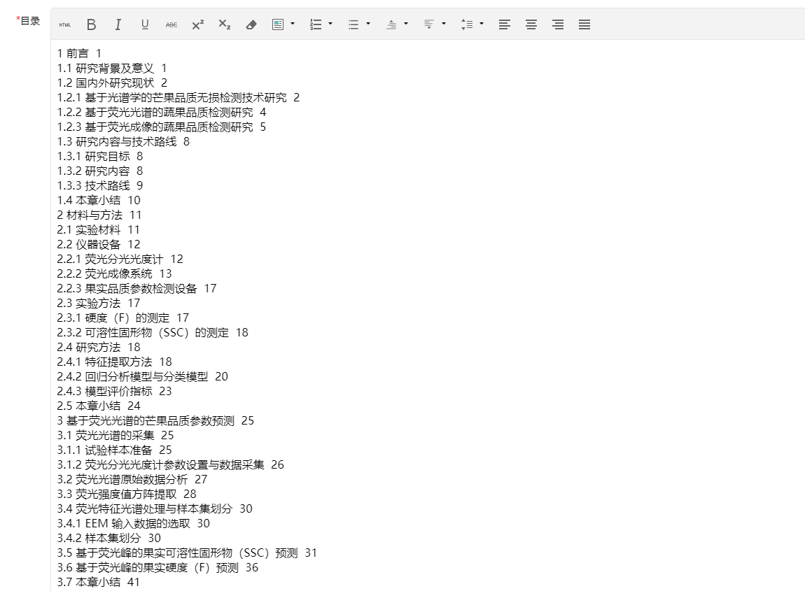 (5)注意事项:“目录”的填写。填写的目录内容须与纸质版学位论文的目录一致,并确保目录的完整性。填写时,直接从学位论文word版中复制目录内容,去掉点号,仅保留一个空格以分隔目录项与页码。正确填写格式可参照图11至图12。