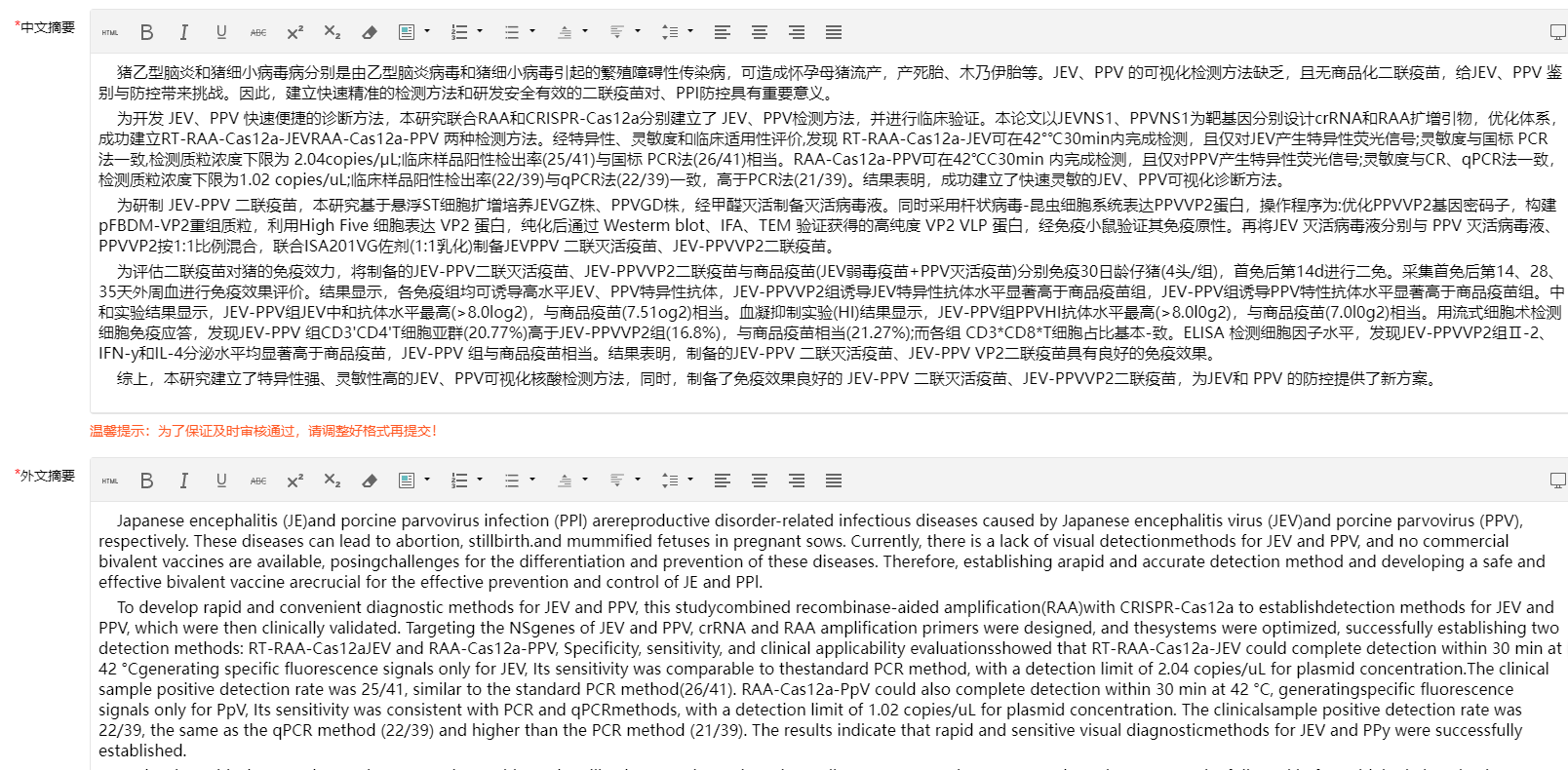 (4)注意事项:“中外文摘要”的填写。直接从word版本的学位论文中复制中外文摘要,且不要手动分行操作。正确格式可参照图10。