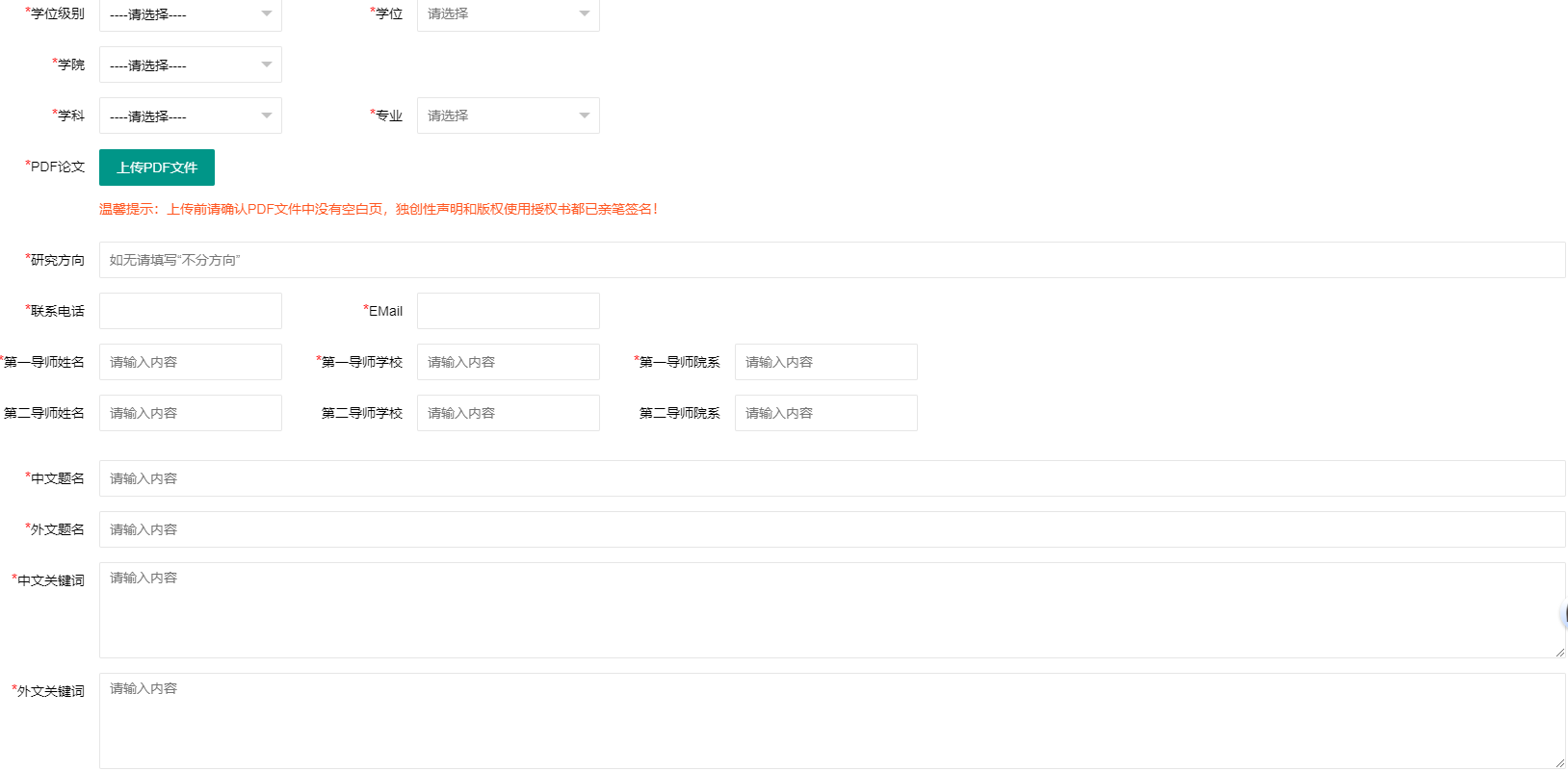 (1)注意事项:上传全文。点击“上传PDF文件”框,从本地盘选择全文文件。如上传全文文件过大或上传出现问题,请与图书馆总馆后座五楼华农文库室联系。