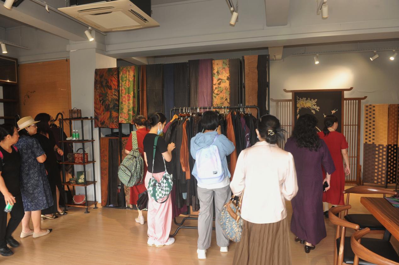 精彩的互动环节后,大家意犹未尽,纷纷移步到香云纱工作室,驻足观看香云纱历史文化墙,抓住难得机会进行穿搭体验,更进一步领略香云纱“千年非遗,东方神韵”的魅力。