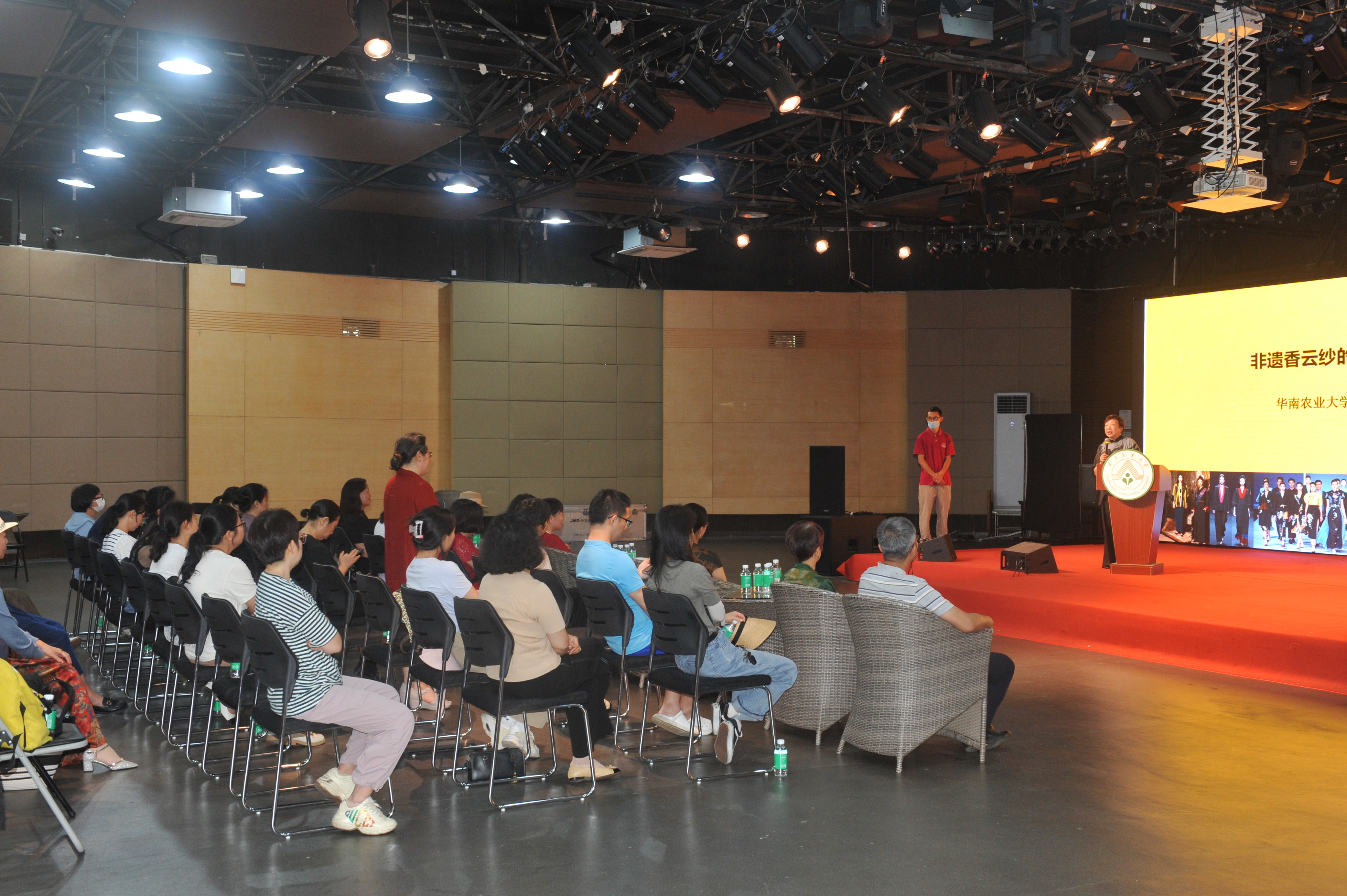 香云纱是采用植物染料薯莨染色的丝绸面料,是广东独有的也是世界纺织品中唯一用纯植物染料染色的丝绸面料,被纺织界誉为“软黄金”,被纳入国家非物质文化遗产名录。金憓教授是本次读书会的特邀嘉宾和主讲人。作为全国“五一巾帼标兵”、中国十佳服装设计师和中国纺织非遗推广大使,她主持了国家艺术基金“破茧成蝶-非遗香云纱时尚化巡展”项目,深耕研究香云纱多年。现场通过“专题讲解+互动交流+现场体验”相结合的文化形式,金憓教授通过视频和图文讲解,像大家娓娓道出了香云纱的前世今生,重点讲述了“三洗九蒸十八晒”的制作工艺;她还根据多年产学研合作的经验和考察,分析了香云纱时代化面临的困境、传承与创新的思路和策略,建议通过衍生品设计如“香云纱+广绣”、“非遗+休闲”和非遗数字化设计如“非遗+科技”等方式,让香云纱更好融入当下生活,同时建议举办各类时尚创意展和香云纱服饰文化研讨会等,让香云纱文化的保护与创新走进学界和科技界。