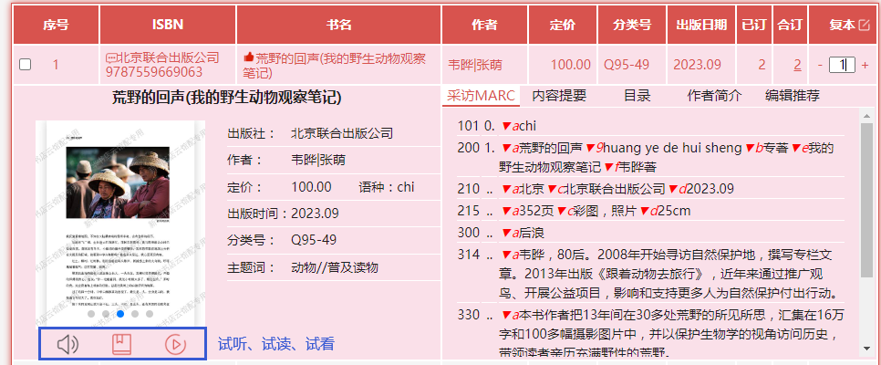 本次秋季展会以专业类目精心布局,依据中国图书馆分类法归集设置,并特设重点图书推荐专区。在线上平台可以轻松浏览图书的类目、封面、内容简介以及MARC数据等信息,部分精选图书更提供试听、试读、预览功能。采选活动打破时间限制,随时随地线上进行,诚邀您的积极参与,图书馆将根据荐购情况酌情订购。