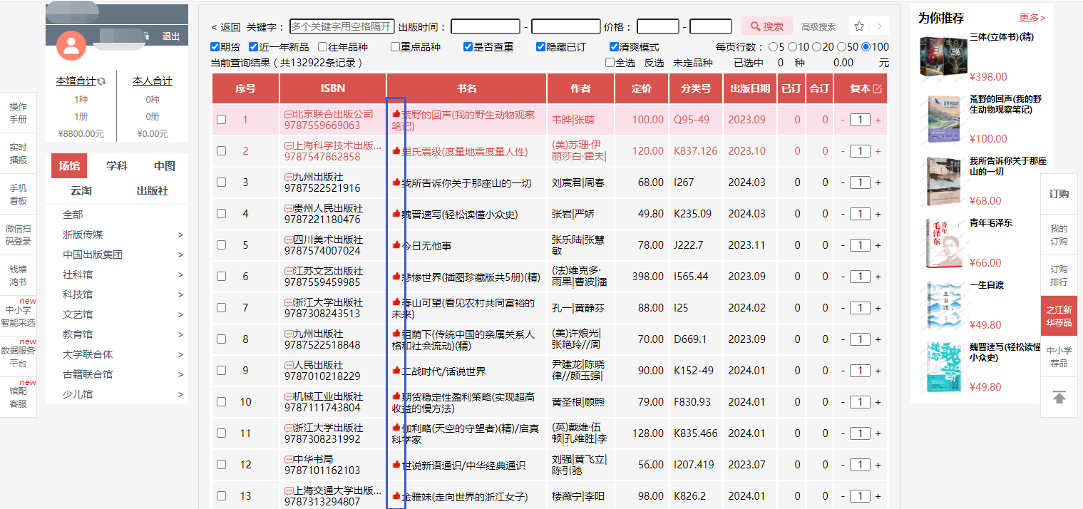 b.读者可在选购页面:进行订购、检索等操作,系统可按图书的中国图书馆分类、出版时间、定价等排序。也可按价格区间、出版时间段、重点图书进行模糊/精准筛选。