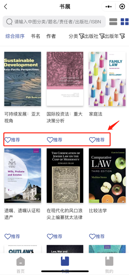 4.点击中间按钮“书展”模块进入荐书界面,可直接输入关键词进行检索,支持按照学科分类、出版社、出版年直接进行筛选和排序。