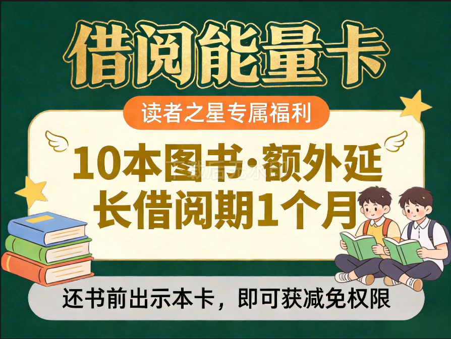 阅读没有终点,书香永无止境。每一位热爱阅读的你,都是图书馆里最闪亮的星。为鼓励更多同学养成良好的阅读习惯,图书馆特为 “读者之星” 提供专属福利:凭借借阅能量卡,可享受额外延长任意十本图书借阅期一个月的权利(需在还书前向工作人员出示借阅能量卡,方能获得相应减免权限)。