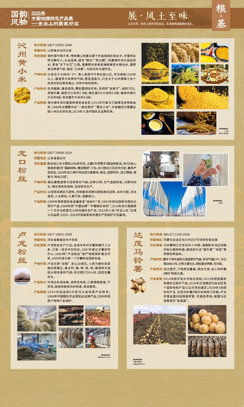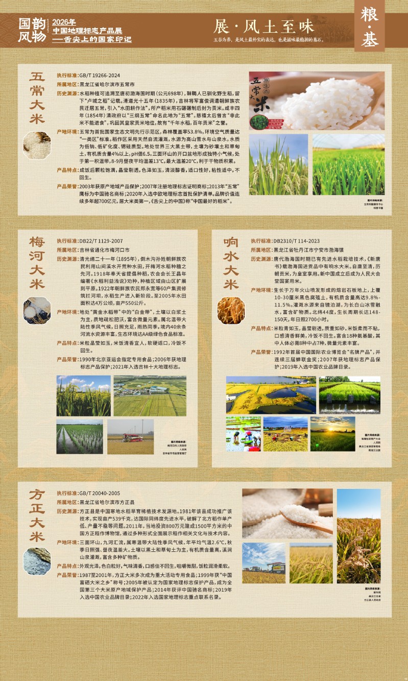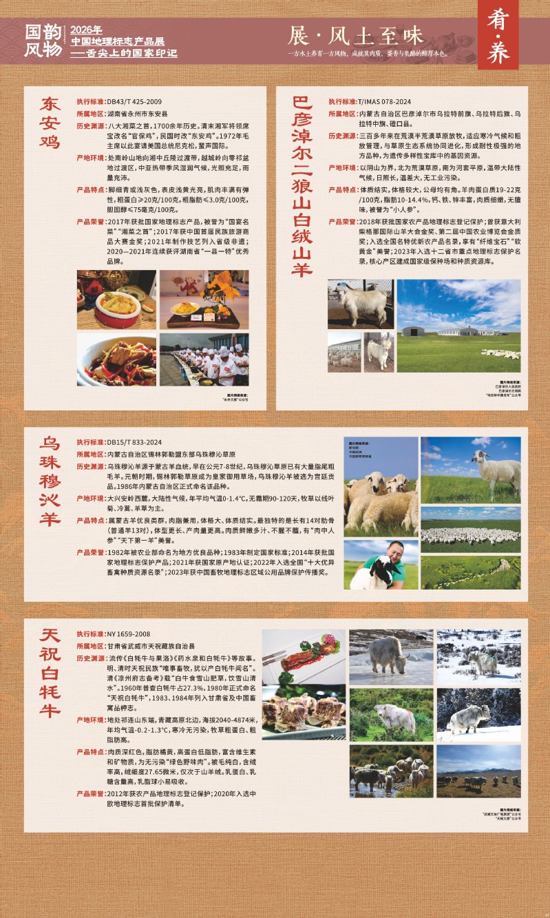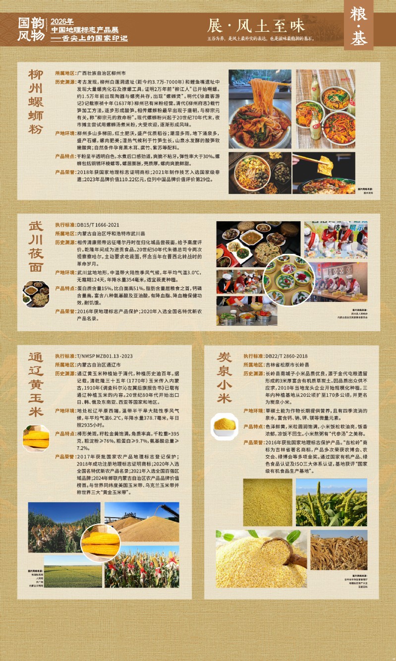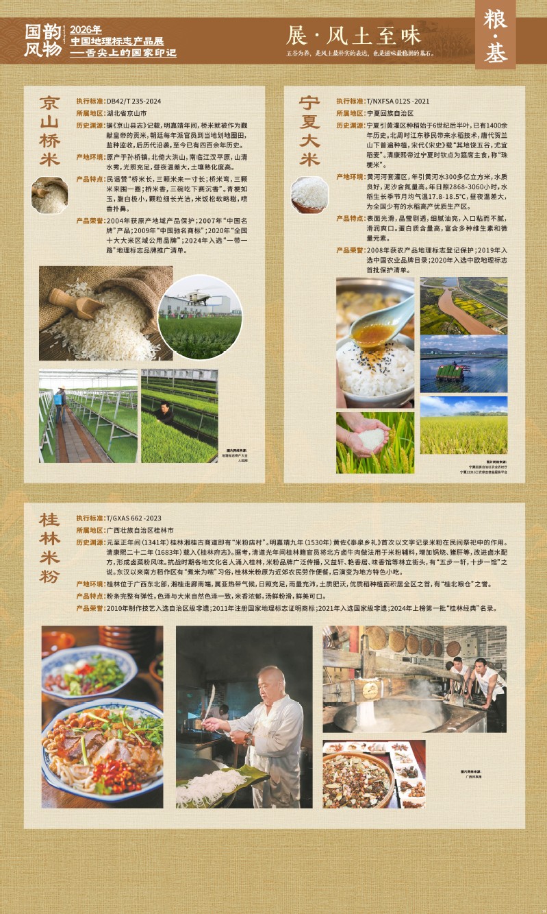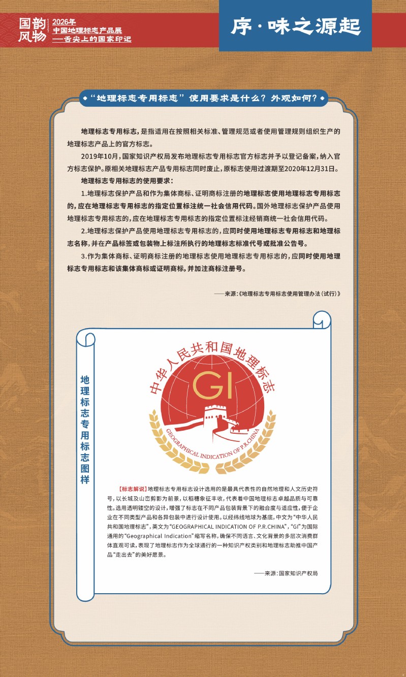 本次展览聚焦于地理标志产品中最贴近日常生活的舌尖风味。循着这缕源于水土的香气,您将走近神州大地的风土至味—一从北国粮仓到江南茶园,从深山秘境到浩瀚湖海。我们期待,通过这次展览,您不仅能感受到地理标志背后的生态密码与匠心传承,更能理解:每一次与地道风味的邂逅,不仅是对味蕾的犒赏,更是对一片土地的致敬、对一种传承的支持。地理标志,它最终指向的,是我们共同的文化认同与生活智慧。