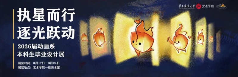 2026年3月17日至24日,华南农业大学艺术学院动画系举办2026届本科毕业设计展。展览以“执星而行,逐光跃动”为主题,围绕“人与智能技术共舞”的时代命题,集中展示动画系2026届本科生在影视动画、数字影像、数字文娱等方向的毕业设计成果,并通过“毕业嘉年华”主题交流活动,搭建学界与业界交流平台,探讨智能动画创作与行业发展议题。